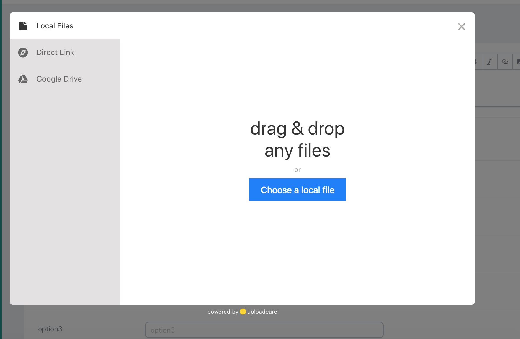 An image field using the UploadCare API.