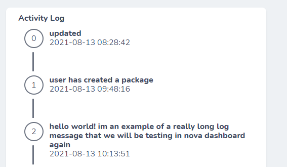 this package is a resource tool that lists activities performed on the resource in the detailed view of the resource. It utilizes Spatie/activity-log package.