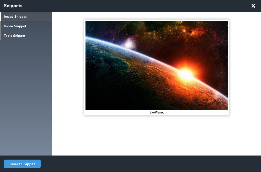 ]),Note: Snippets will only render CkEditor Elements.
