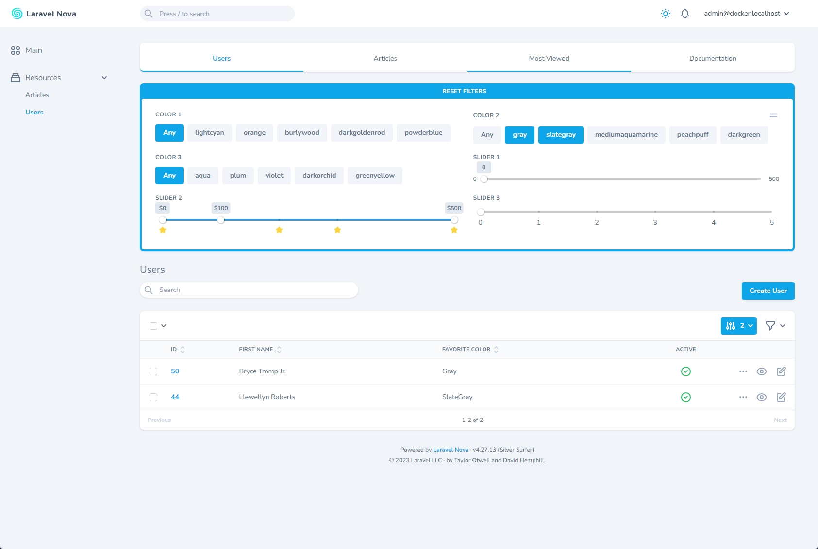 - Nova Slider Filter - A Laravel Nova filter for picking range between a min/max value.