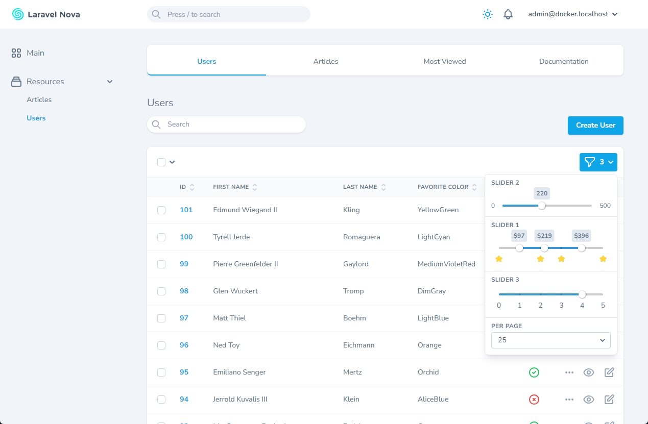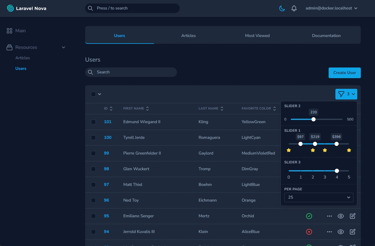 - Nova Slider Filter - A Laravel Nova filter for picking range between a min/max value.