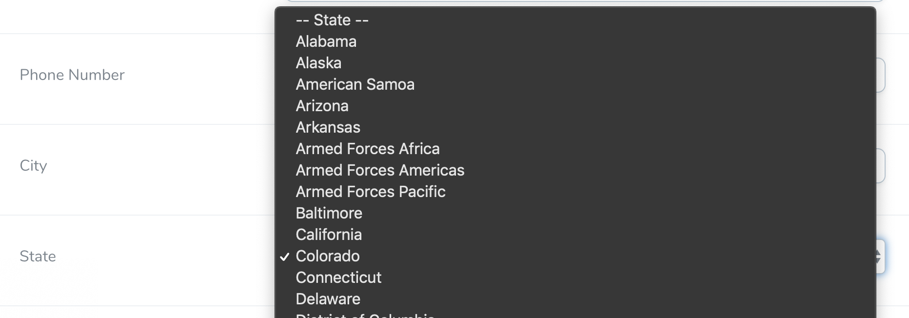 - Pre-populates a select dropdown field with all of the states in the United States