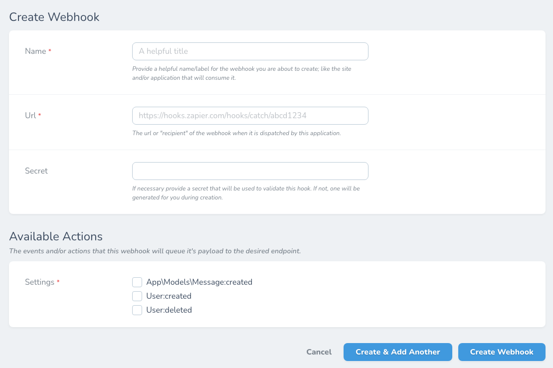 The fields that the "baked-in" Webhook resource provides are relatively self-explanatory. All fields are required except for the hook's secret key. This will be auto-generated for you if you do not provide one your self. In most cases, your webhooks will not need a secret key for validation; both Zapier and IFTTT do not require any authorization.