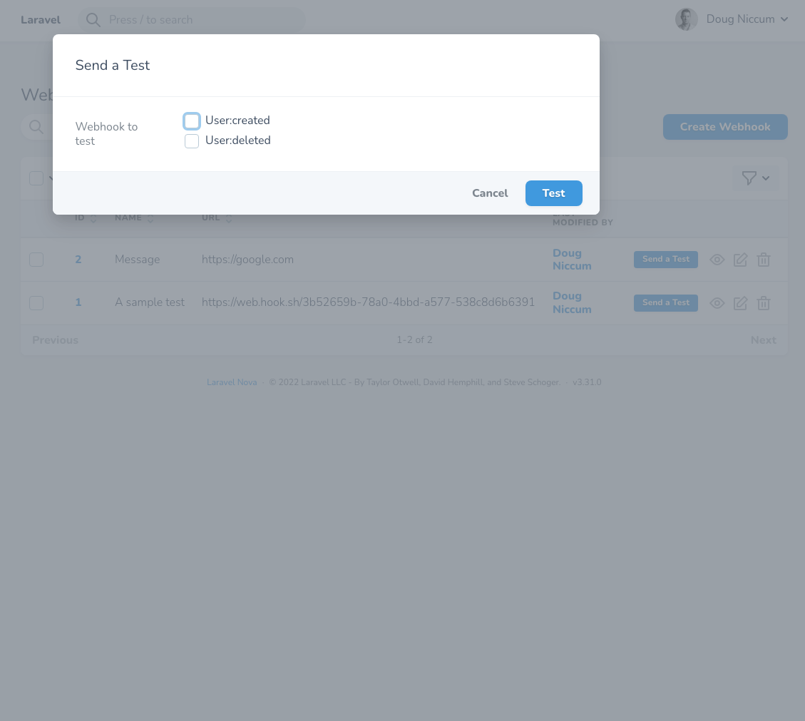 Probably the most important part of any webhook is testing and validation that your webhook is working correctly and providing the necessary information to the prescribed endpoint. This package gives you the ability to do such an action based on the Eloquent events that you have selected for this webhook. Simply select the hook that you want to test and then utilize the Nova Actions toolbar or the inline button to launch the testing action, and then indicate which model and corresponding model event that you want to test.