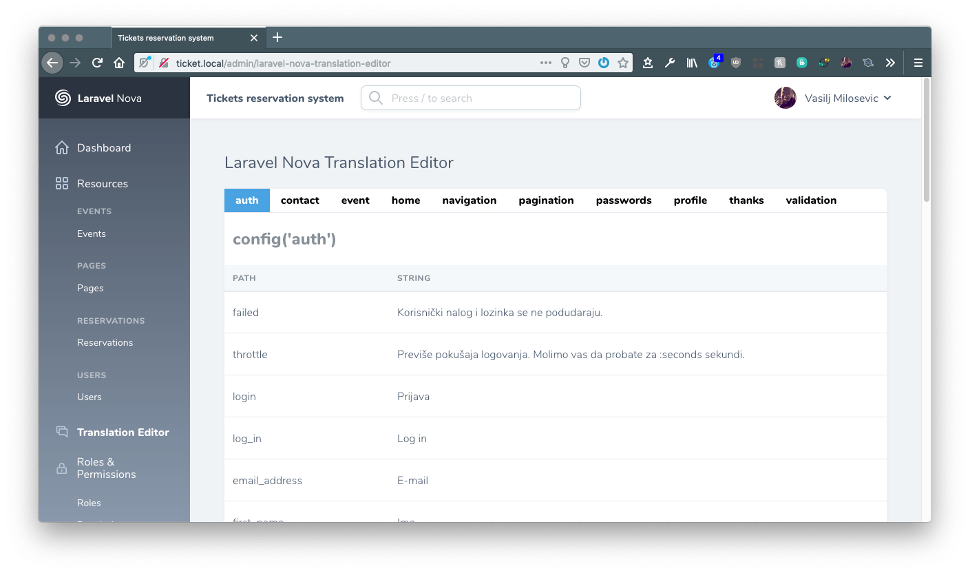 You can view all the translations. Clicking on string you can edit it and save. The mutlilevel arrays in lang files are currently not working. So if you have idea on how to solve it. Please make a pull request.