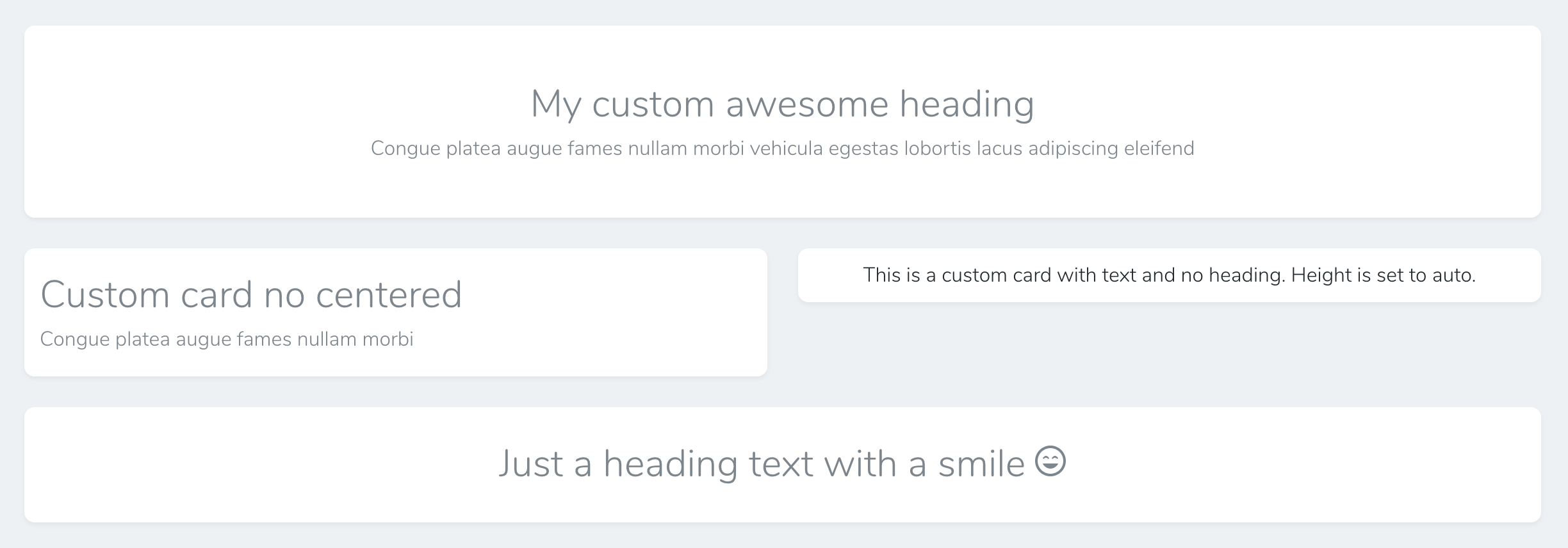 ->text('<h4 class="font-light">This is a custom card with text and no heading. Height is set to auto.</h4>')
