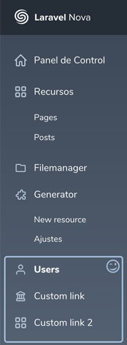->name('string')The name of your link. You can use text and also a translation helper:__('My link')->to('link')The link. You can use any nova link. Default to '/'->icon('svg icon')Svg string icon. Default to use tool icon.
