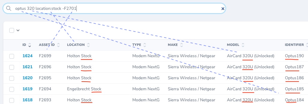 $smartSearch = new SmartSearch($search, 'asset_id|location|type|make|model|identifier');The parsed search-string can now be used to perform filtering in one or more contexts: