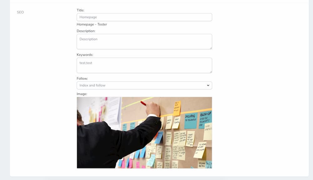 'seo' => Seo::renderAttributes('SEO title', 'SEO description', 'SEO keywords', 'SEO image', 'index, follow'), // Builds the seo array