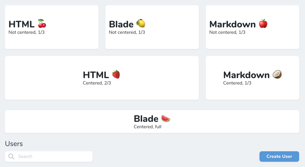 (new HtmlCard())->width('1/3')->html('<h1>Hello World!</h1>'),
