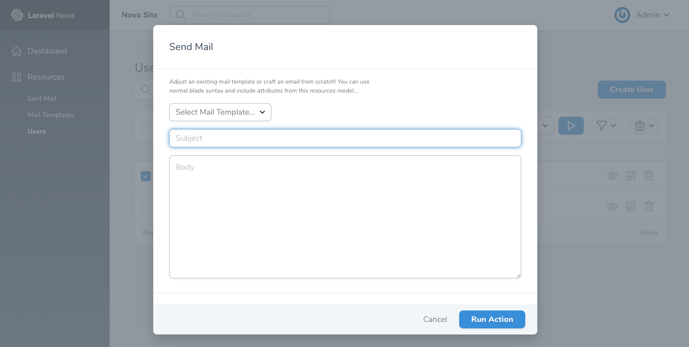 The SendMail action inserts a mail form directly into a Nova action modal. This action allows you to quickly send an email directly to one or more resources.