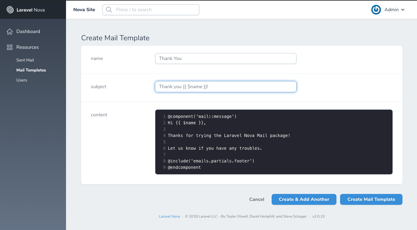 The NovaMailTemplate resource allows you to create re-usable custom templates for sending email. It works by taking your specified template (or over-ridden template content) and building a temporary blade file (the Blade file can be saved permantely via a configuration option). This blade file is then used in the typical Laravel fashion to send the email.