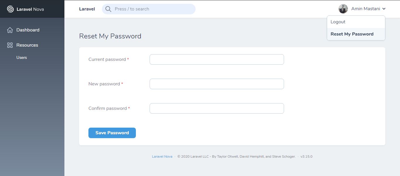 $ composer require mastani/nova-password-resetPublish the view (Will overwrite 'user.blade.php' which is provided by nova):