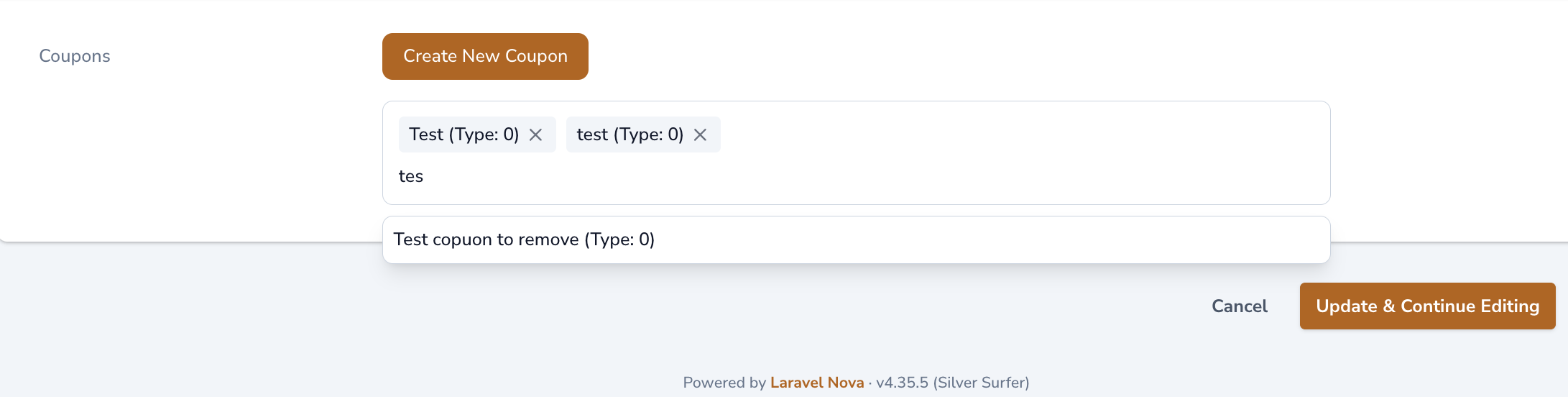 return "{$coupon?->Name} (Type: {$coupon->Type})";