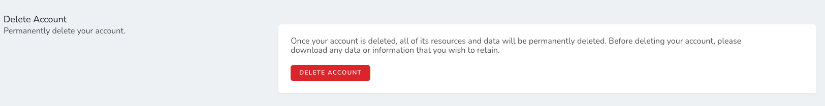 Provide the functionality to delete the user account by confirming existing current password.