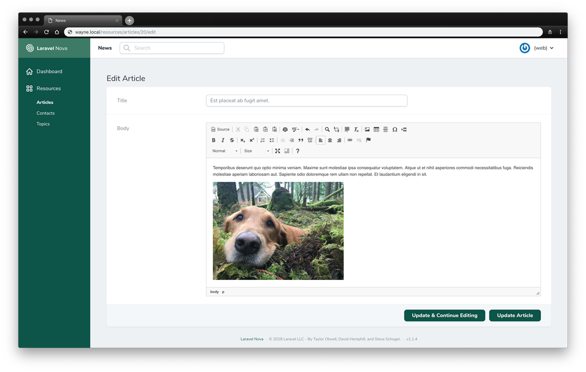 composer require waynestate/nova-ckeditor4-fieldBy default the CKEditor 4 instance used is the latest (4.22.1) Full All version (https://cdn.ckeditor.com/). If you wish to use a different CKEditor 4 you can do so by publishing and editing the configuration.